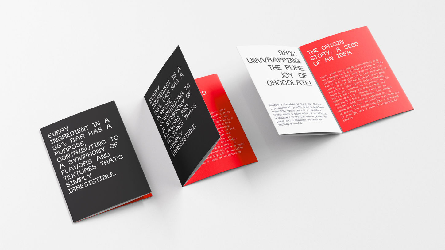 Our core focus is on creating chocolates that are not only delicious but genuinely beneficial, moving away from the conventional guilt associated with sweets. The brand name, 98%, serves as a direct and bold statement of our commitment to a high percentage of healthy, pure ingredients. A key differentiator for 98% is our innovative design-centric approach to sales. We believe that the visual appeal of our products is as crucial as their taste and health benefits. This translates into thoughtfully designed packaging where the "98%" text is the undeniable highlight, prominently featured and integrated with a color palette specifically chosen to reflect and