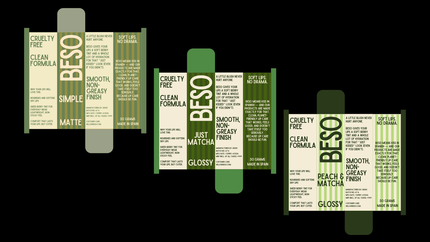BESO’s packaging system was designed to cut through visual noise with confident colour, bold typography, and playful language that instantly communicates attitude. By pairing a consistent graphic structure with expressive flavour names and punchy copy, the design creates high recall and strong shelf presence while remaining clear and premium. The result is a distinctive, scalable identity that makes lip care feel fun, relatable, and self-assured — turning a functional product into a bold personal statement.